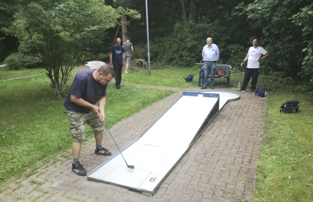 Doch noch bevor man sich von dem Gegenteil überzeugen konnte wurde zum Essenfassen gerufen. Die Heimmannschaft, um den hilfsbereiten Sportwart René Lagerquist, lud zum „gemeinsamen“ Grillen ein, bei dem an nichts mangelte und sogar auf vegetarische Wünsche eingegangen worden wäre. Nach einer kurzen Begrüßung setzten sich beide Teams an separate Tische. Zwar für alle Beteiligten schade, da der Austausch und das Kennenlernen ein wenig gehindert wurden, aber absolut verständlich und verantwortungsvoll. Minigolfen mag im Jahr 2020 zwar anders aussehen, zeichnet sich aber gerade durch diese rücksichtsvollen Gesten aus und trifft dadurch wieder den sportlichen Charakter, bei dem man seinem Gegenüber mit größtmöglichen Respekt und Wertschätzung auf und neben dem Platz begegnet.
