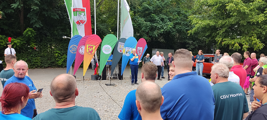Die Eröffnung der Deutschen Meisterschaften verlief reibungslos, abgesehen von einigen vereinzelten Regentropfen. Neben Ansprachen von Petra Gransee (NBV), Sebastian von Block (DMV), Walther Raffler (1. Vorsitzender des 1. Essener CGC Blau-Gold und stellv. DCV-Aktivensprecher), Sarah Böse (DCV-Präsidentin) und Vertretern aus der Politik setzte eine Bergmannskapelle zur Nationalhymne und – passend zum Ruhrgebiet – zum Steigerlied an.